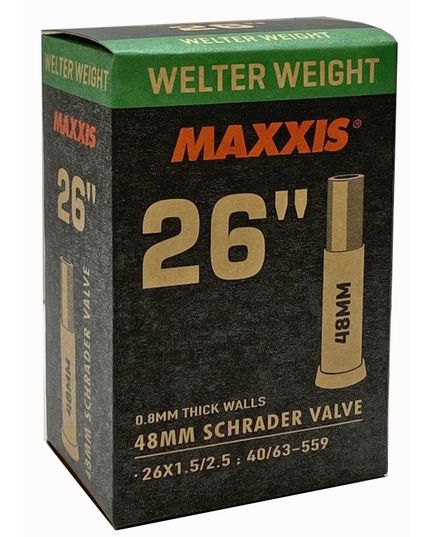 Камера Maxxis Welter Weight 26x1.5/2.5 - це надійна і універсальна камера, розроблена для велосипедів з колесами 26". Вона поєднує в собі баланс міцності та помірної ваги, що робить її підходящим вибором для активного катання: від міських поїздок до стійких до трейлових маршрутів. Стінка камери механічних пошкоджень, при цьому не додаючи зайвої ваги велосипеду.