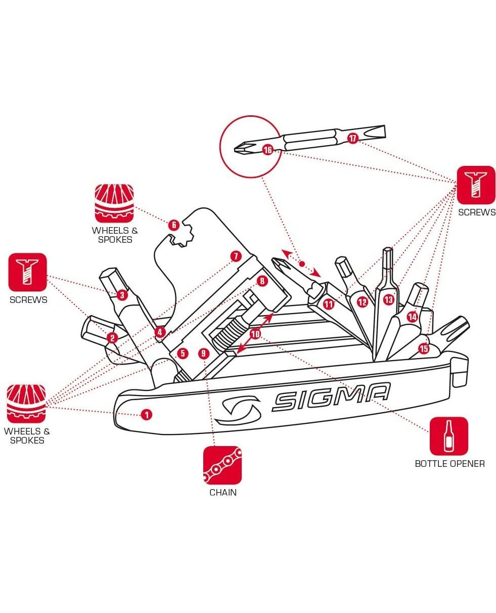 Мультитул Pocket Tool Medium Sigma Sport SD63001 — це компактний і функціональний набір інструментів, який завжди зручно мати при собі у велопоїздці або подорожі. У середньому розмірі він поєднує в собі достатню кількість ключів і викруток для більшості типових ремонтів на ходу, при цьому залишаючись легким і зручним для перенесення в кишені веломайка, рамі або велосумці.