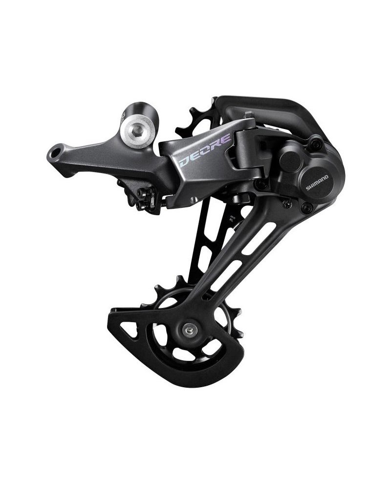 Задній перемикач RD-M6100-SGS DEORE для 12 швидкісної трансмісії має довгий важіль та максимальну ємність зубів. Перемикач використовує ту ж платформну базу, що й дорожчі перемикачі серії XT і XTR, але за кратно меншу ціну. Форма паралелограма максимально прихована в габарит пір'я, щоб знизити можливість пошкодити перемикач. Фрикційна муфта забезпечує стабільність ланцюга на вибоїнах і при стрибках.
