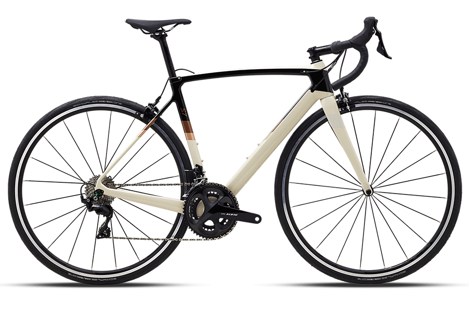 | Початкова модель Strattos S2 вже комплектується карбоновою вилкою і шосейною трансмісією CLARIS, при вазі трохи більше десяти кілограмів. |