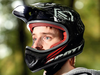 Фулл-фейс – по своему устройству напоминает шлем для мотоциклистов. Массивная конструкция, закрывающая не только голову, но и нижнюю часть лица, защищает велосипедиста при катании на скоростных спусках. Фулл-фейс используется в даунхилле и фрирайде. Тяжелым и некомфортным он будет на подъемах или в длительных поездках.