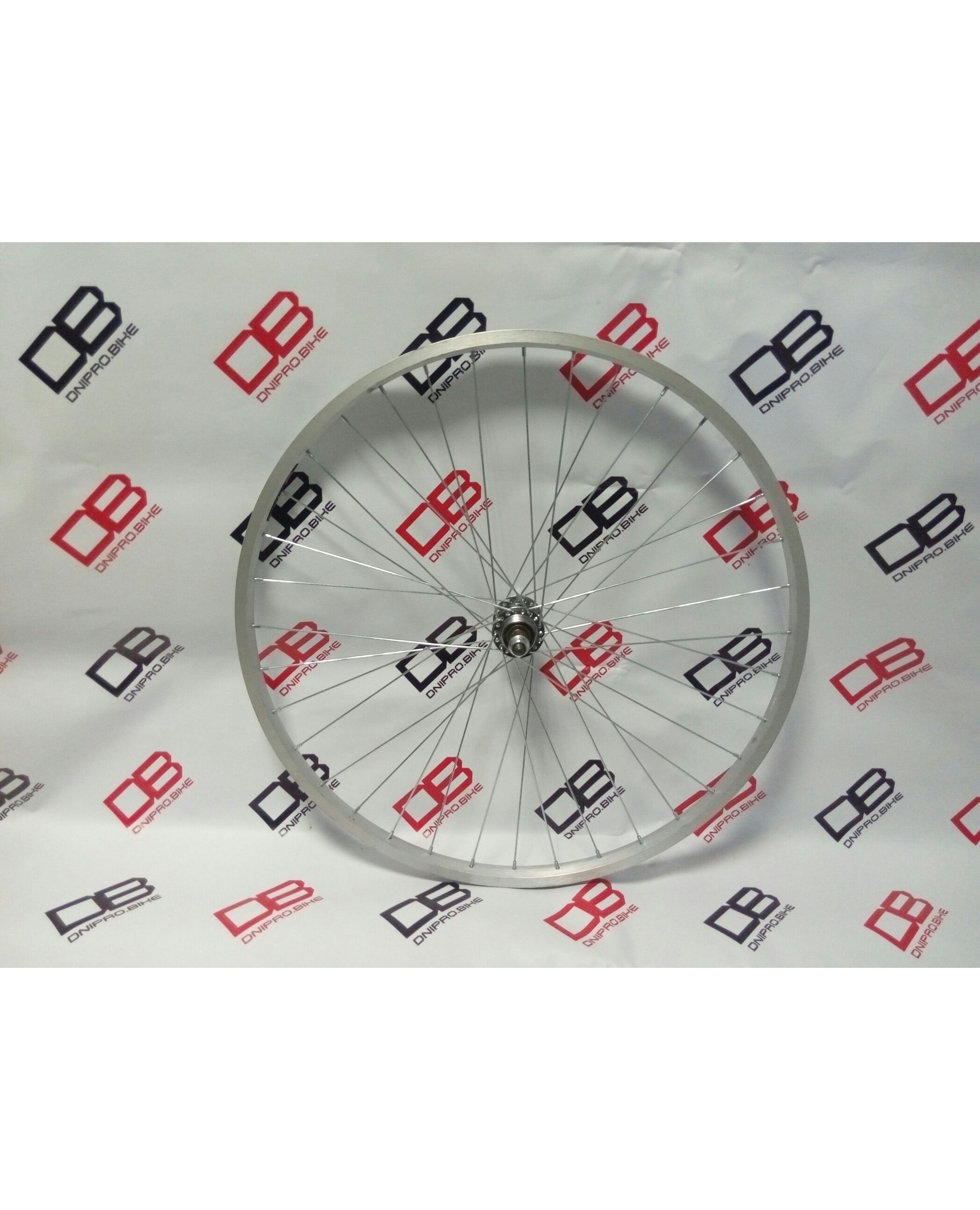 Колесо полностью собранное и готовое для установки на ваш велосипед.Втулка на насыпных подшипниках, обод рассчитан под тормоз V-brake (ободной тормоз).