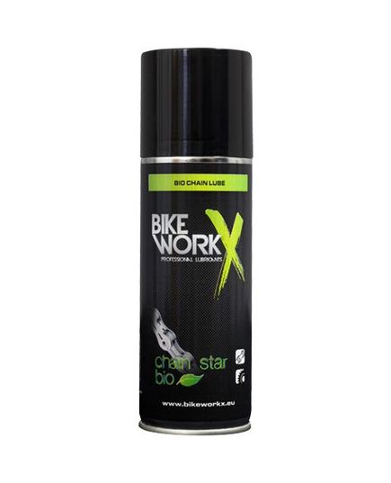 BikeWorkX Сhain Star BIO - універсальне мастило для ланцюга на основі синтетичного масла і ефірів цинку. Призначена не тільки для змазування ланцюга але і механізмів в цілому (тросів, компонентів, що обертаються і труться механізмів). Ідеально проникає в рухомі частини, відторгає вологу і зберігає від корозії. Безпечно для навколишнього середовища.